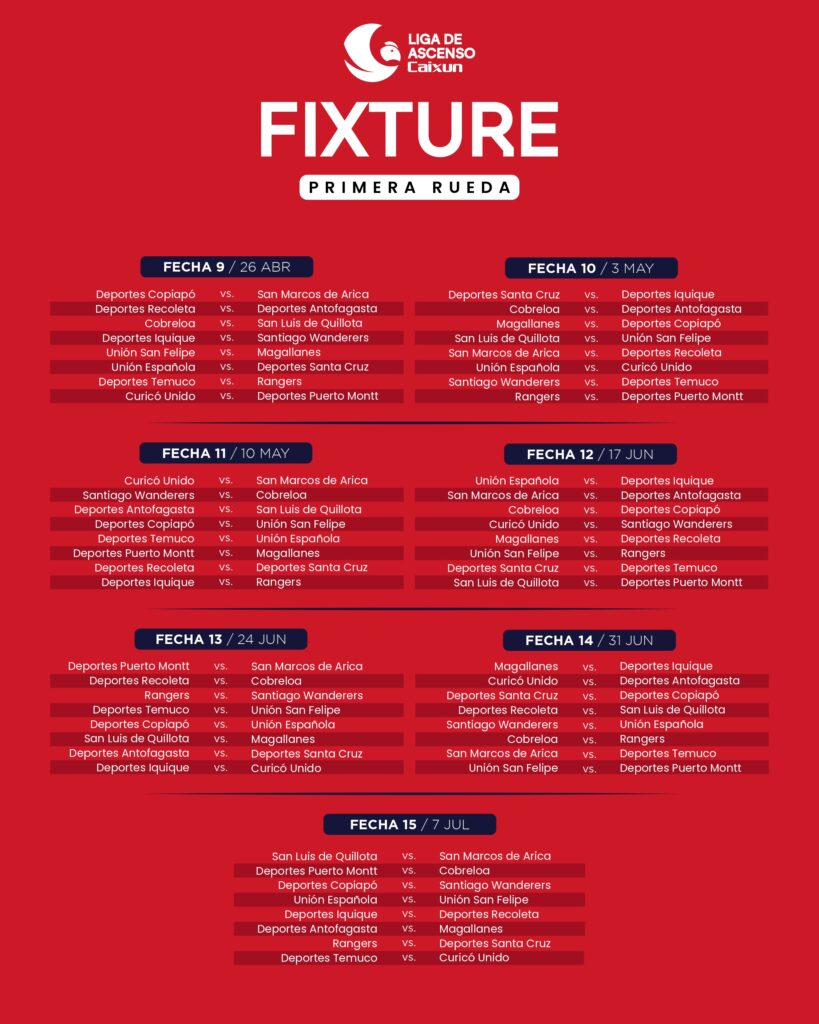 La primera mitad del torneo se extenderá hasta la semana del 7 de julio, fecha en la que San Marcos cerrará la rueda inicial enfrentando a San Luis de Quillota como visitante. Será un duelo clave para medir el pulso del equipo en un escenario tradicionalmente difícil y ante un rival que suele pelear en la parte alta.