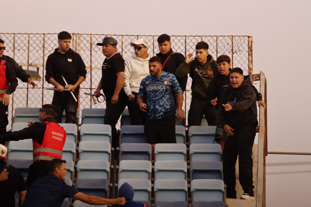 Una vez dentro del recinto, los simpatizantes iquiqueños comenzaron a lanzar cánticos provocadores hacia la barra local, lo que generó la reacción inmediata de un grupo de barristas ariqueños que se desplazó para encararlos. La tensión escaló rápidamente en una trifulca que se extendió por varios minutos.